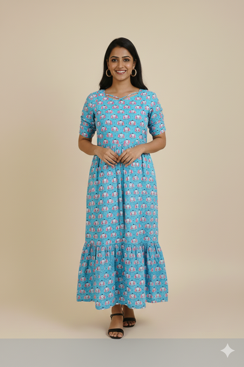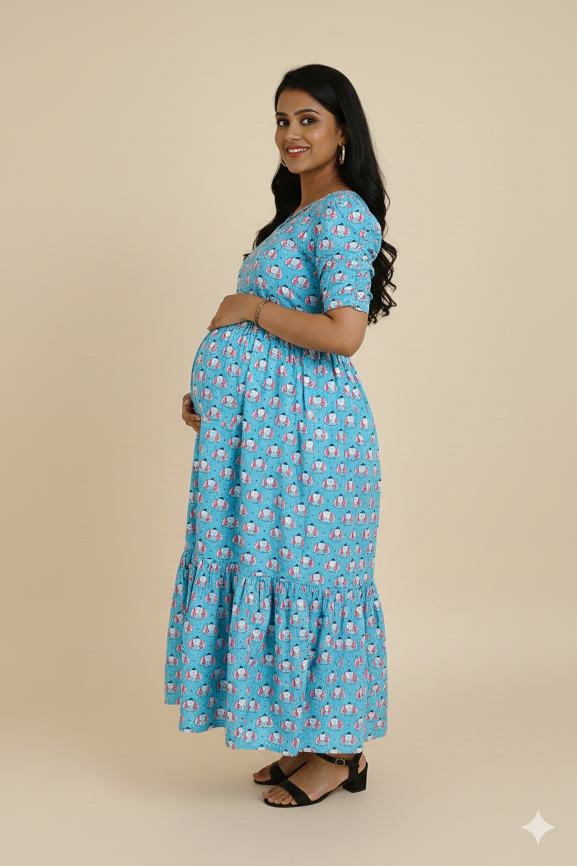 ❥ Cotton Cambric 2-Tier Feeding Maxi Dress designed for comfortable maternity & nursing wear