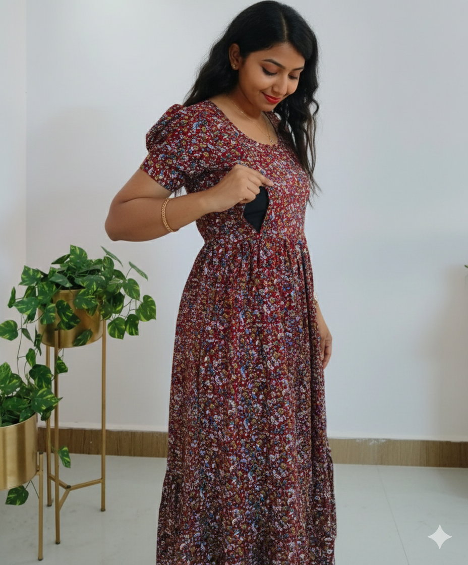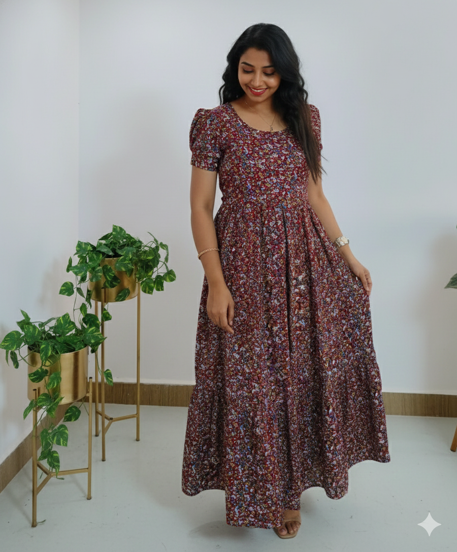 ❥ Delta Crepe 2-Tier Maxi Dress with Puff Sleeves designed for effortless everyday elegance