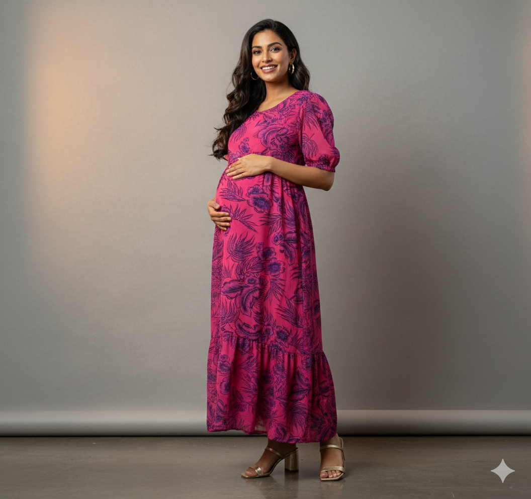 Premium Georgette Floral 2-Tier Feeding Maxi Dress – Pink